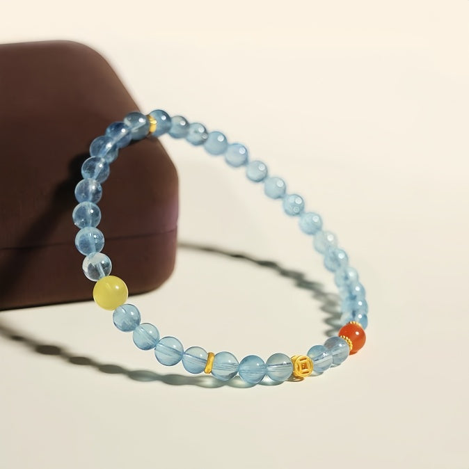 This bracelet is crafted with soothing aquamarine beads, accented with red agate and yellow jade for an elegant touch of balance and strength. Aquamarine enhances clarity and communication, red agate provides grounding and passion, while yellow jade inspires confidence and optimism. Together, they form a powerful talisman for self-expression, courage, and harmonious connections.